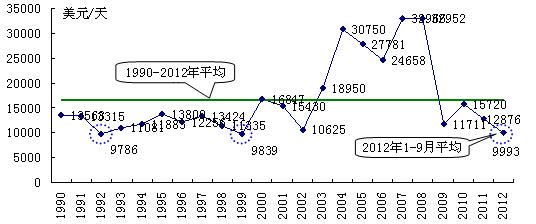 經濟復蘇乏力或內生動力不足直接對全球政治、軍事、民生、金融等產生極其不利影響,使從來沒清澈過的地球村變得更為渾濁,發展前景變得更為不確定性,對本已十分低迷的航運市場形成新的壓力與沖擊,直接把今年國際航運業拖入了歷史罕見的冰點。2012 年1-9月克拉克松航運綜合費率平均水平跌破1萬美元/天關口,與1992年和1999年水平相當;BDI平均點數下跌至907點,創出1999年以來的新低。