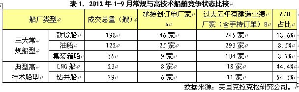 當人們欣喜看到2010年船舶市場“強勁復蘇”,寄希望2011年仍能保持這種態勢的時候,2011年世界經濟、貿易、航運市場風云突變,船舶市場外部環境再度發生惡化,加上隱藏于船舶市場船舶產業深層次矛盾與問題的不斷暴露,船舶市場重返下行通道,2012年這種情況變得更為糟糕。按克拉克松公司統計,2012年1-9月全球累計成交新船訂單781艘、3230萬載重噸,月均360萬載重噸,較上一年月均成交量下滑46%,甚至比2009年月均水平(上次谷底)還低25%,呈典型“二次探底”之勢。隨著成交量的持續萎縮,新船價格進一步下滑,2012年9月底克拉克松新船價格指數報收于127點,較上年底下跌12點,并創下2008年價格下行以來的新低。
