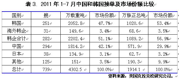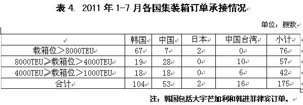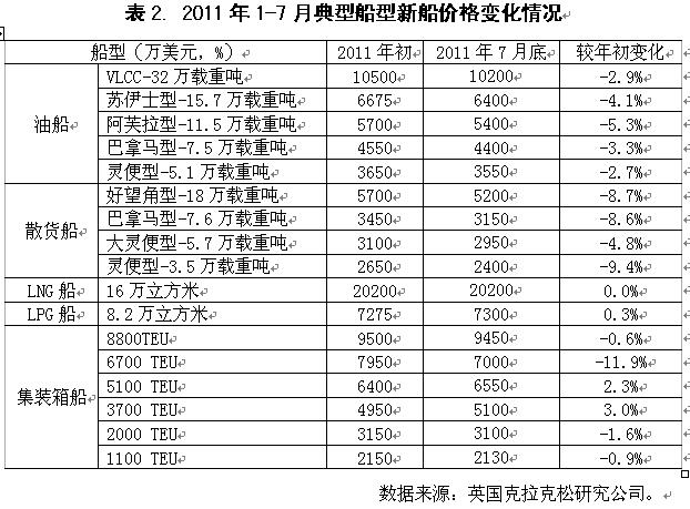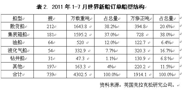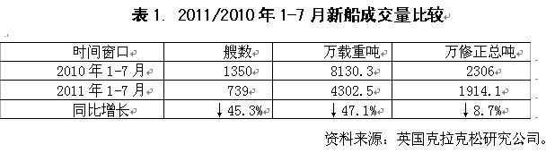 2011年1-7月國際造船市場新船需求總量同比出現大幅下滑,但需求結構朝高技術高附加值船型轉變,受此影響,全球船舶市場競爭格局也發生顯著變化。從影響行情發展主要因素看,無論是經濟發展、航運市場供求關系,還是船舶融資市場狀況,下半年出現明顯改觀的難度很大,船舶市場面臨形勢更加復雜嚴峻。