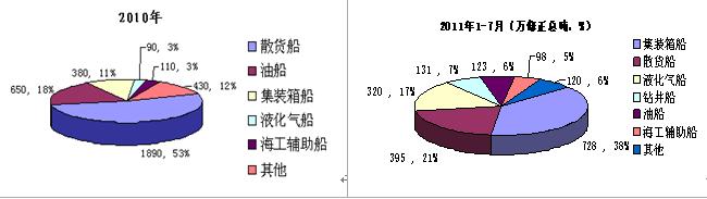 第一,2011年新船成交量再度大幅回落已成定局,細分船型市場輪動性進一步加強。按今年1-7月成交態勢測算,今年全年成交量大致在8000萬載重噸左右,較上一年下滑幅度極有可能超過40%。從細分船型市場發展而言,下半年散貨船市場總體上持續低迷;油船市場成交量可能會出現明顯改善;集裝箱船、液化氣船、大型海洋工程裝備產品以及個別特種船型在整個新造船市場中表現或作用將更加突出,但下半年這些細分市場行情可能較上半年有所遜色,應引起大家關注。