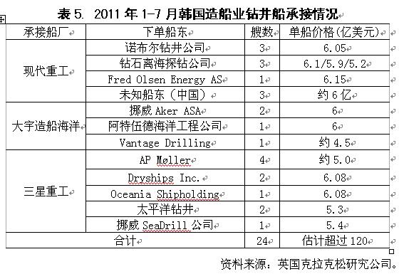 第二,韓國船企基本上壟斷大型海工裝備市場。截至到7月底,全球共有31艘鉆井船成交,除了7艘由巴西南大西洋船廠(三星重工持有該廠股份,并為其提供技術支持)承接之外,其余船舶均被韓國三大造船集團囊括,總價值金額超過120億美金,相當于220艘18萬噸級好望角型散貨船價值量(當前價)。除鉆井船外,韓國船企還承接了價格不菲的FPSO(浮式生產儲存與卸載系統)、FPSO/LNG和FSO(浮式產品儲存與卸載系統)訂單。與此形成鮮明對比的是,這一期間其他造船國承接到上述產品卻寥寥無幾。