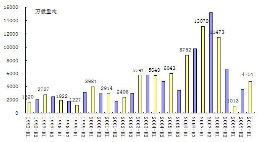 上半年新船成交量超預期。據英國克拉克松公司統計,2010年上半年全球累計成交新船624艘、4751萬載重噸,同比上升369%,其中,第二季度新船成交量明顯放大,月均成交量達1102萬載重噸,是第一季度平均單月成交量(482萬載重噸)的2.3倍,甚至超過2003-2006年興旺前期月均成交量水平。