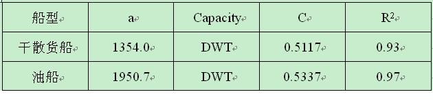 此基線公式由丹麥根據LR的Fairpiay中的數據,結合當時初步EEDI計算方式,通過一定假設以Capacity為自變量,采用指數函數的形式向IMO組織提出。通過對現有船型的回歸分析,得出其相應的a和c的數值。
