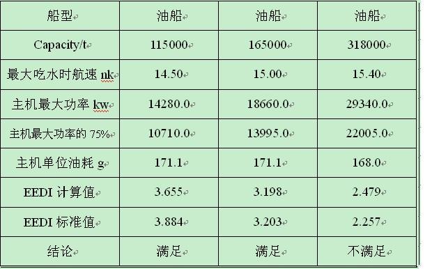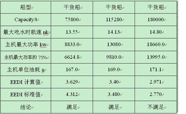 按EEDI的計算公式,對常規的三艘散貨船(75800t、115280t、180000t)進行計算結果DWT75800t散貨船符合要求有余度;DWT115280t散貨船符合要求無余度;DWT180000t散貨船不滿足要求(詳見附表1)。