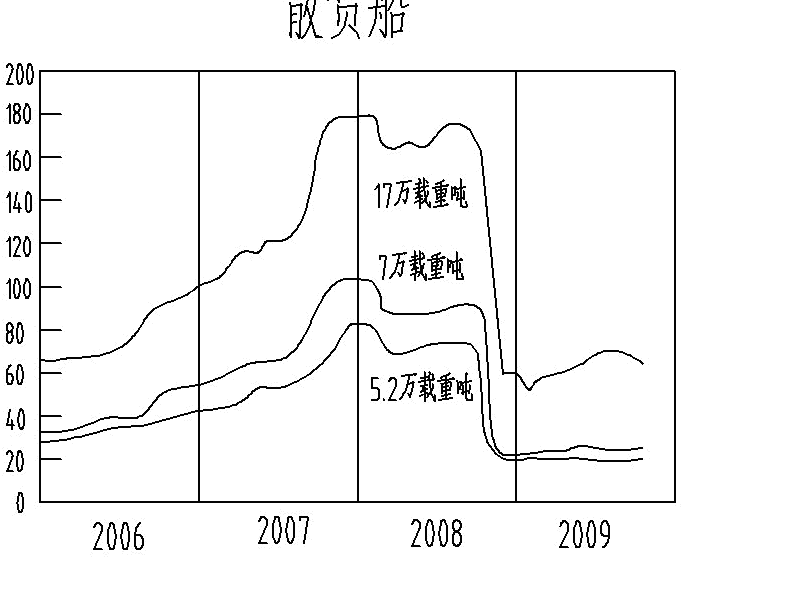 以下是2006年1月-2009年10月世界部分船型(散貨船)新船現售價格走勢圖