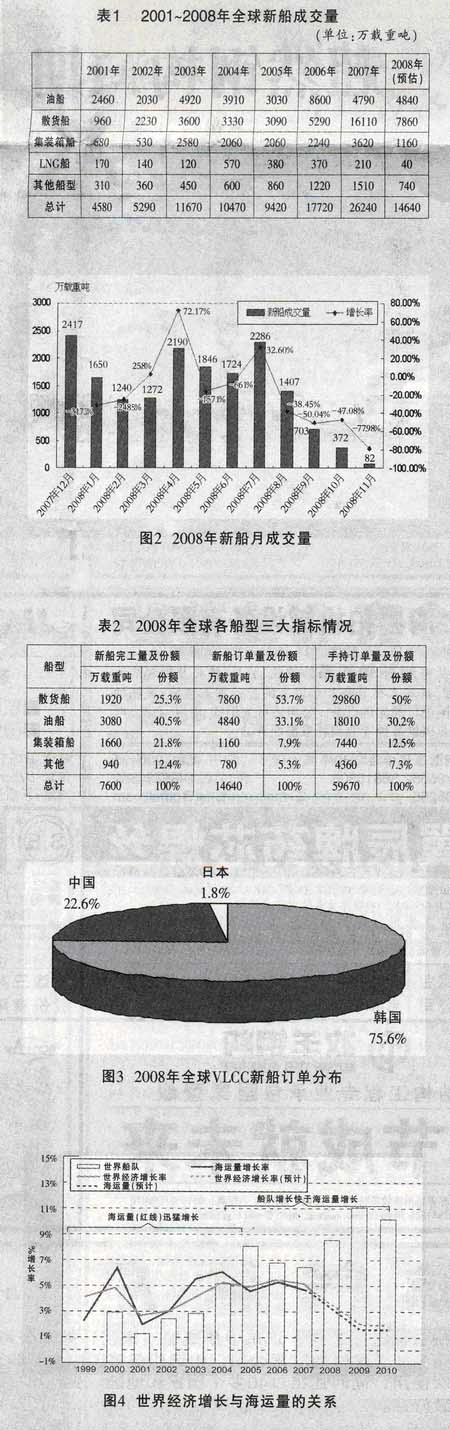 2008年,全球新船成交約2028艘、1.45億載重噸,以載重噸計(jì),比2007年下降了44.6%,也明顯低于2006年的水平,但仍高于2000~2005年的年均成交量,在多重不利因素的相繼沖擊下,新船訂造市場(chǎng)交出這樣的成績(jī)單也算差強(qiáng)人意。但從單月的成交量看,整個(gè)市場(chǎng)逐月下滑的趨勢(shì)非常明顯。