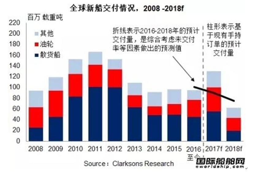 在新簽訂單量大幅減少和交付量穩定的共同作用下,全球手持訂單量加速縮水:2016年12月初手持訂單量為3,713艘,2.3億載重噸,較年初相比縮減27%。按數量統計,散貨船仍占手持訂單的27%,油輪和集裝箱船則分別為23%和11%。如果以2015年的產能為基準粗略估計,當前的手持訂單量僅能平均維持船廠未來2.4年的生產。(來源:克拉克森研究)