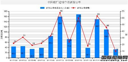 據克拉克松統計,2016年1月,中國船廠接獲新船訂單僅10艘,32.0萬CGT,環比下降了70.6%,同比下降了60.9%。