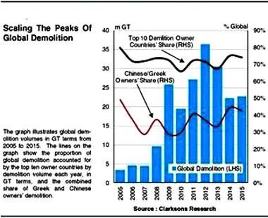 雖然拆船有所放緩,2014年和2015年的拆船總量約高于2005年至2013年年平均1810萬GT的25%。受中國出口至印度廉價鋼坯的影響,廢鋼價格走低,自2015年來,降幅已達40%。
