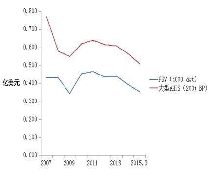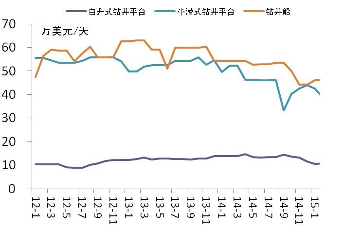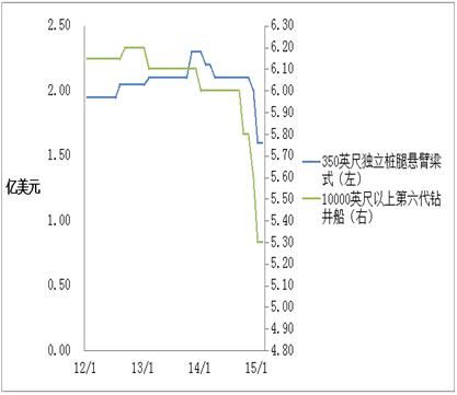 2)年初以來,350英尺自升式鉆井平臺價格累計降幅達20%左右,海洋工程船價格平均降幅約10%,其中技術含量較低的中小型海洋工程船表現較為明顯。