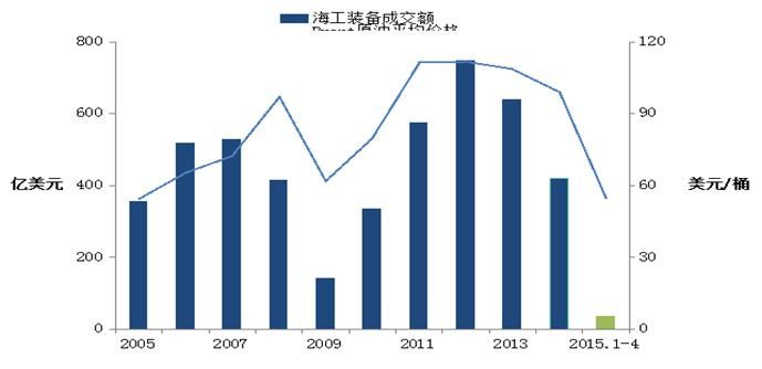 1)在預期油價維持低位、油公司大幅削減投資的背景下,2015年海工裝備市場成交額將大幅回落,按1-4月成交趨勢外推全年約為110億美元,即使考慮后期市場有所改善,預計全年也難以突破200億美元。