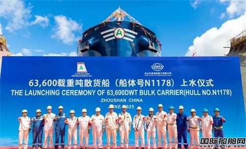 6月30日,舟山中遠海運重工為Alpha Bulkers公司建造的第2艘63600噸散貨船N1178項目在公司2號船臺舉行上水儀式。