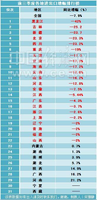中國經濟網記者疏理制作了前三季度各地進出口情況表,表中可以看出外貿形勢的復雜與嚴峻性,除了寧夏、西藏兩地未公布數據,在已經公布的29個省區中,有22省區外貿進出口值均為負增長。其中黑龍江情況最差,以同下降42%為全國倒數第一,吉林同比下降25.2%倒數第二,新疆同比下降23.7%倒數第三。東北三省在做整體經濟不振的情況下,進出口貿易受到的不良影響也十分明顯。