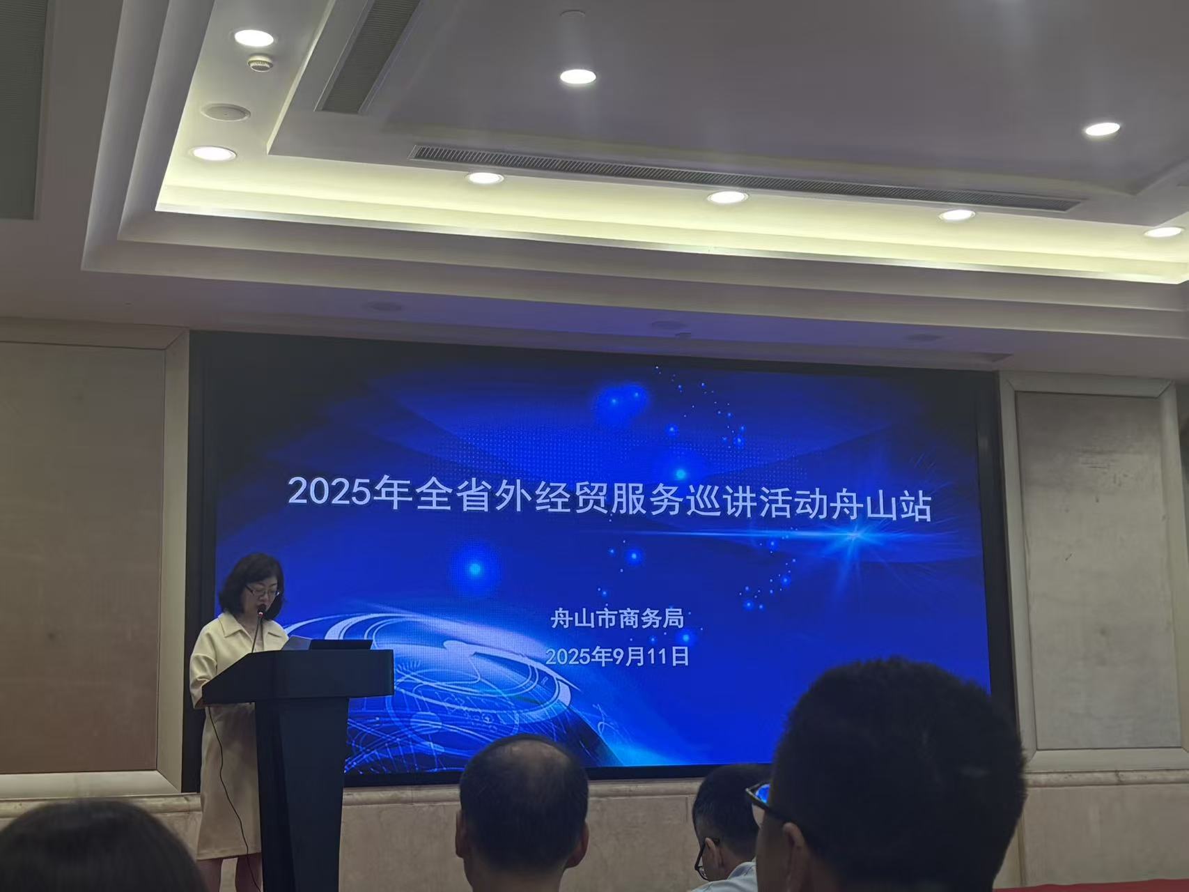 9月11日上午,“2025年全省外經(jīng)貿(mào)服務(wù)巡講”第六站——舟山站成功在新城舉辦。本次活動(dòng)由浙江省對(duì)外經(jīng)濟(jì)貿(mào)易學(xué)會(huì)與舟山市商務(wù)局聯(lián)合主辦、舟山市對(duì)外經(jīng)濟(jì)貿(mào)易企業(yè)協(xié)會(huì)協(xié)辦,旨在幫助外貿(mào)企業(yè)應(yīng)對(duì)國(guó)際經(jīng)貿(mào)新形勢(shì),拓展海外市場(chǎng),提升綜合競(jìng)爭(zhēng)力。省商務(wù)廳財(cái)務(wù)審計(jì)處、投資促進(jìn)中心、省外經(jīng)貿(mào)學(xué)會(huì)、省國(guó)際博覽中心等相關(guān)領(lǐng)導(dǎo),以及中信保浙江分公司、杭州思億歐科技集團(tuán)股份有限公司、商務(wù)主管部門、省級(jí)外貿(mào)預(yù)警點(diǎn)等相關(guān)負(fù)責(zé)人出席活動(dòng)。舟山市外經(jīng)貿(mào)企業(yè)代表積極參與,現(xiàn)場(chǎng)氣氛熱烈,互動(dòng)積極。